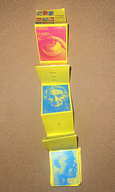 For Project 3, I created a book only using photos taken from the web. Since I wasn't allowed to use any original content I thought it would be fun to create a game based around the idea of AI images becoming more and more popular throughout the internet. I used photographic portraits of people that I found while scrolling through Pinterest and made them into a game where players have to guess whether the photos are real (taken by a camera) or AI generated. I wanted to mimic the action of scrolling on a phone so I used accordian folds so that players would scroll through the photos while playing.